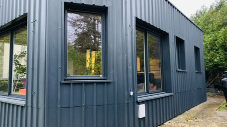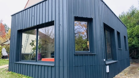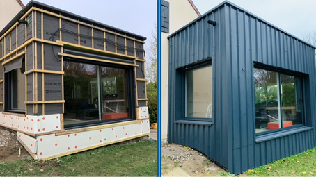 - Pose d’un bardage en bac-acier gris anthracite sur extension en bois.